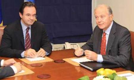 Προηγήθηκε νωρίς το πρωί η συνεργασία του κ. Παπακωνσταντίνου με τον διοικητή της Τράπεζας της Ελλάδος Γ.Προβόπουλο, στην οποία εξετάστηκε η κατάσταση του εγχώριου πιστωτικού συστήματος και το αίτημα που κατέθεσαν οι τέσσερεις μεγαλύτερες εμπορικές τράπεζες στην κυβέρνηση για την αξιοποίηση των εγγυήσεων του Δημοσίου, προκειμένου να αντλήσουν κεφάλαια από την Ευρωπαϊκή Κεντρική Τράπεζα.